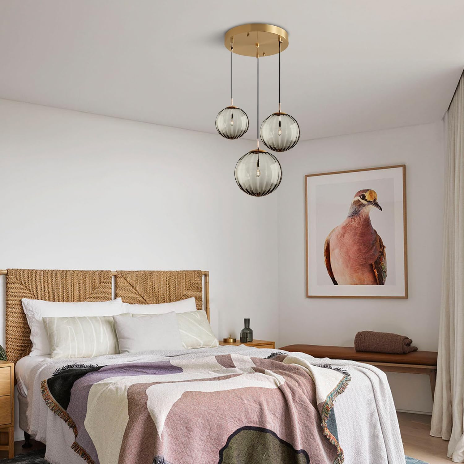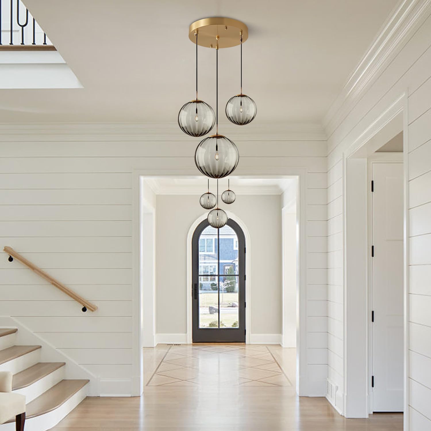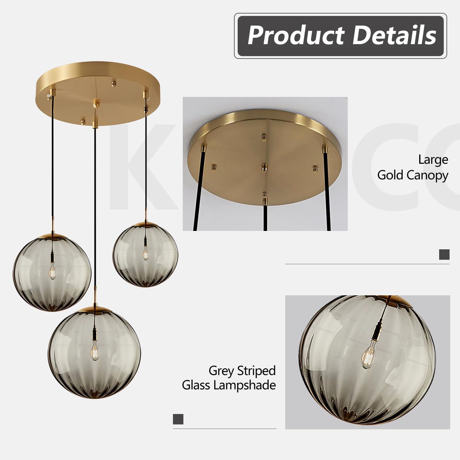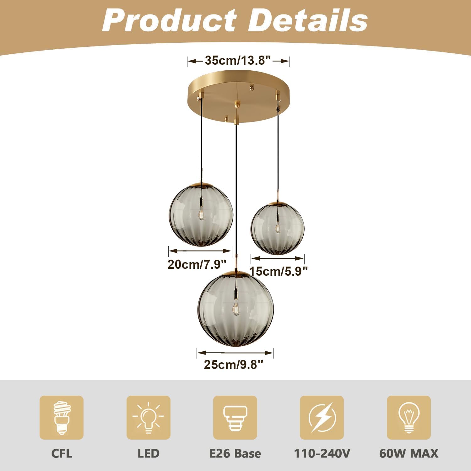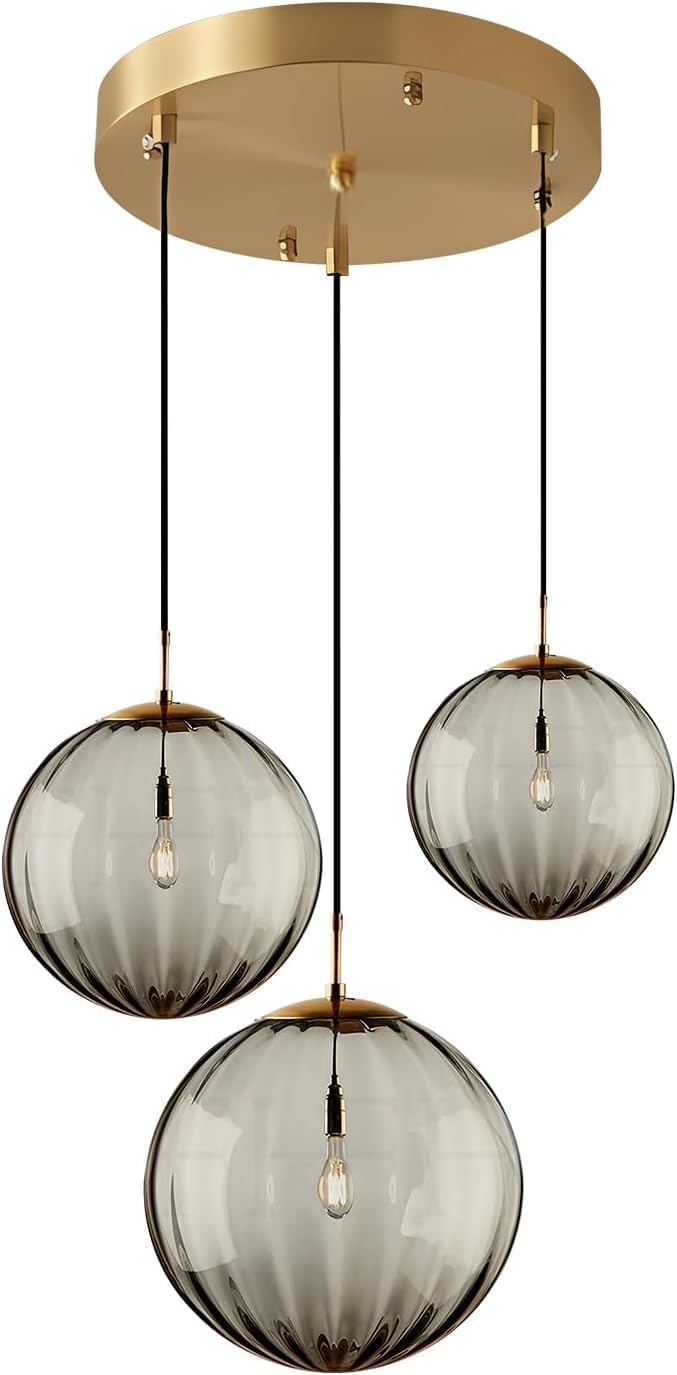 Bring subtle elegance to your interiors with this smoke grey glass pendant light trio. Each of the three hand-blown globes—measuring 25cm, 20cm, and 15cm—hangs from a large 13.8-inch gold canopy on adjustable cords, allowing for customized arrangements. Compatible with E26 bulbs, this fixture suits a wide range of indoor spaces.