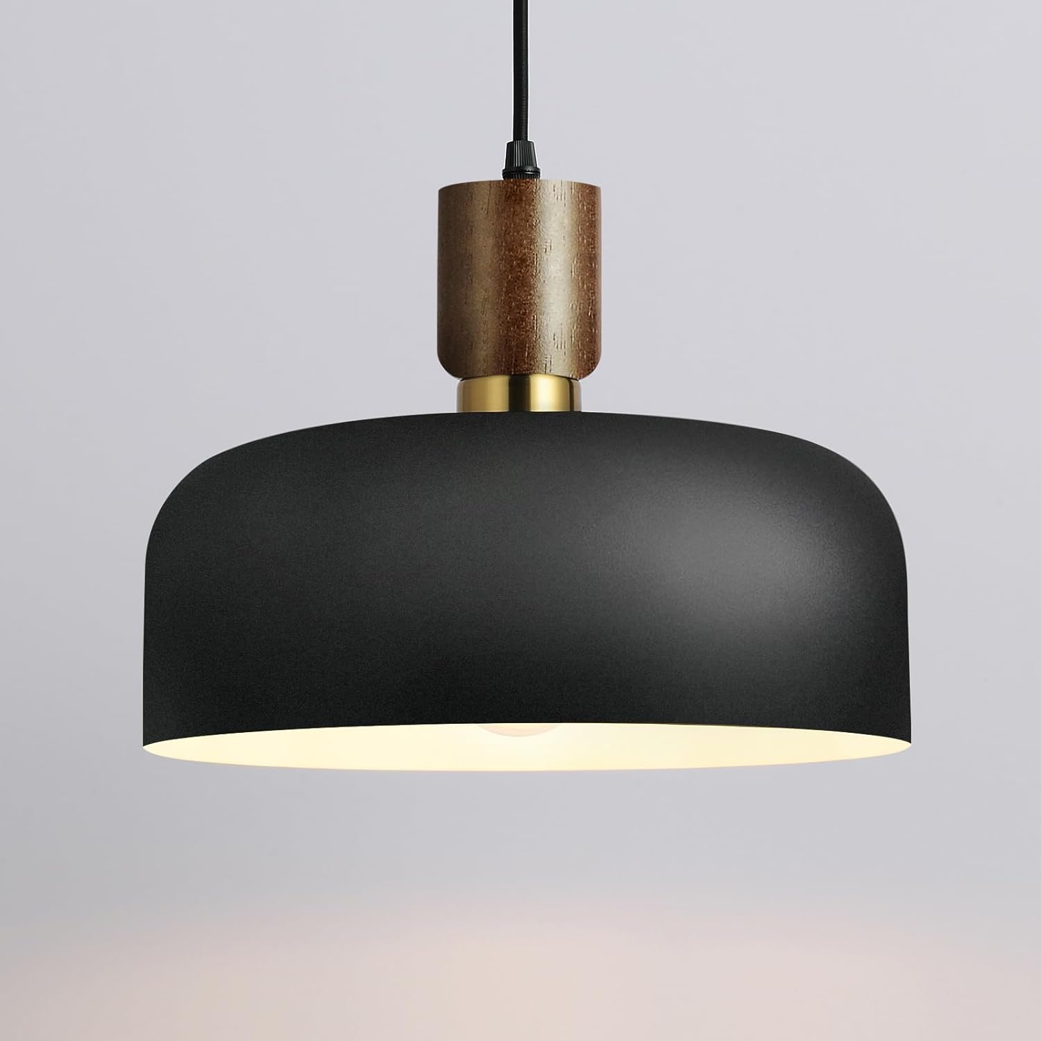 Design Feature: Natural wood top + matte black dome shade