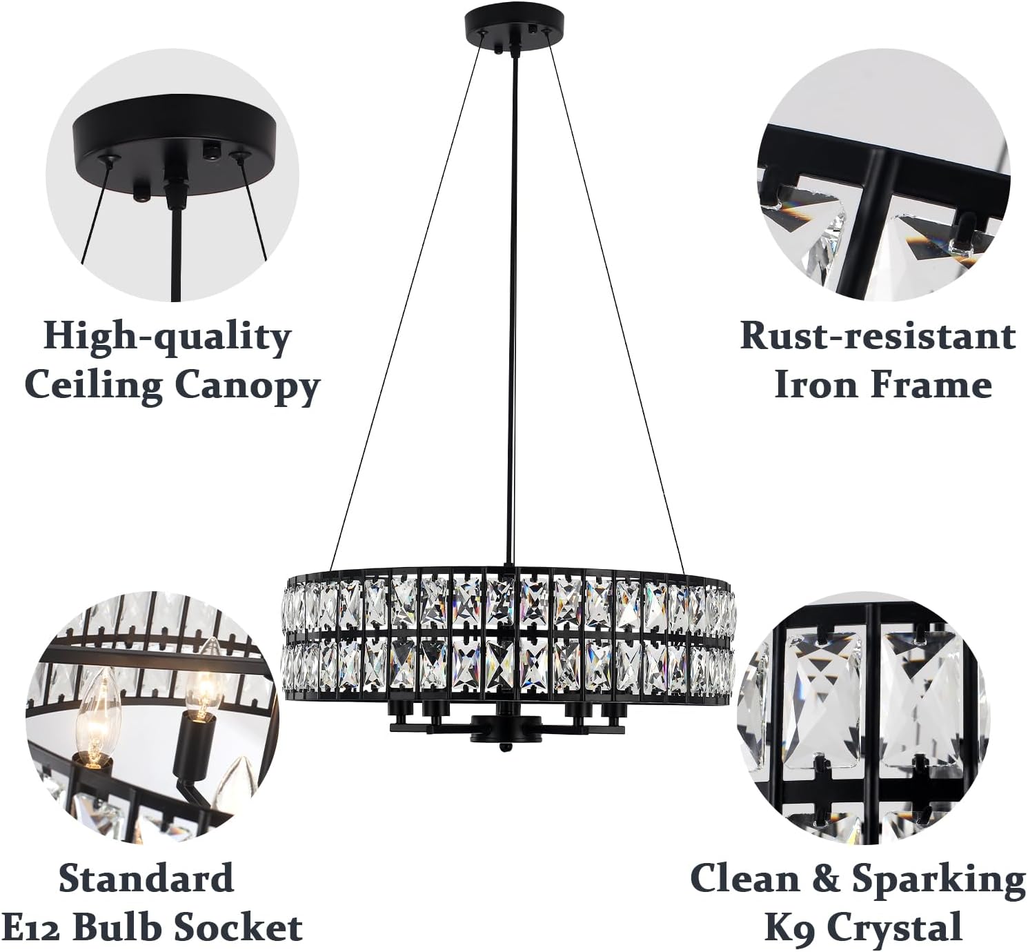 This elegant crystal pendant features a black rust-resistant frame with sparkling K9 crystals in a round silhouette. Adjustable in height from 27.5 to 51.1 inches, it's perfect for dining rooms, bedrooms, and foyers. Compatible with E12 base bulbs.