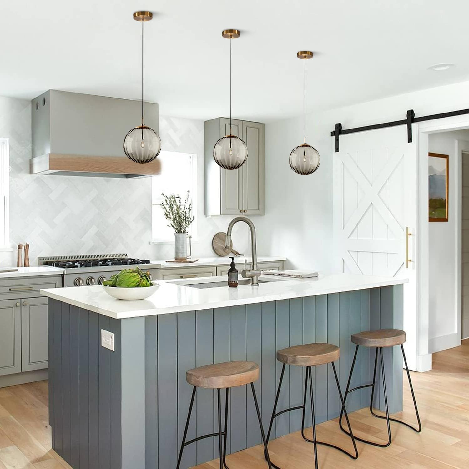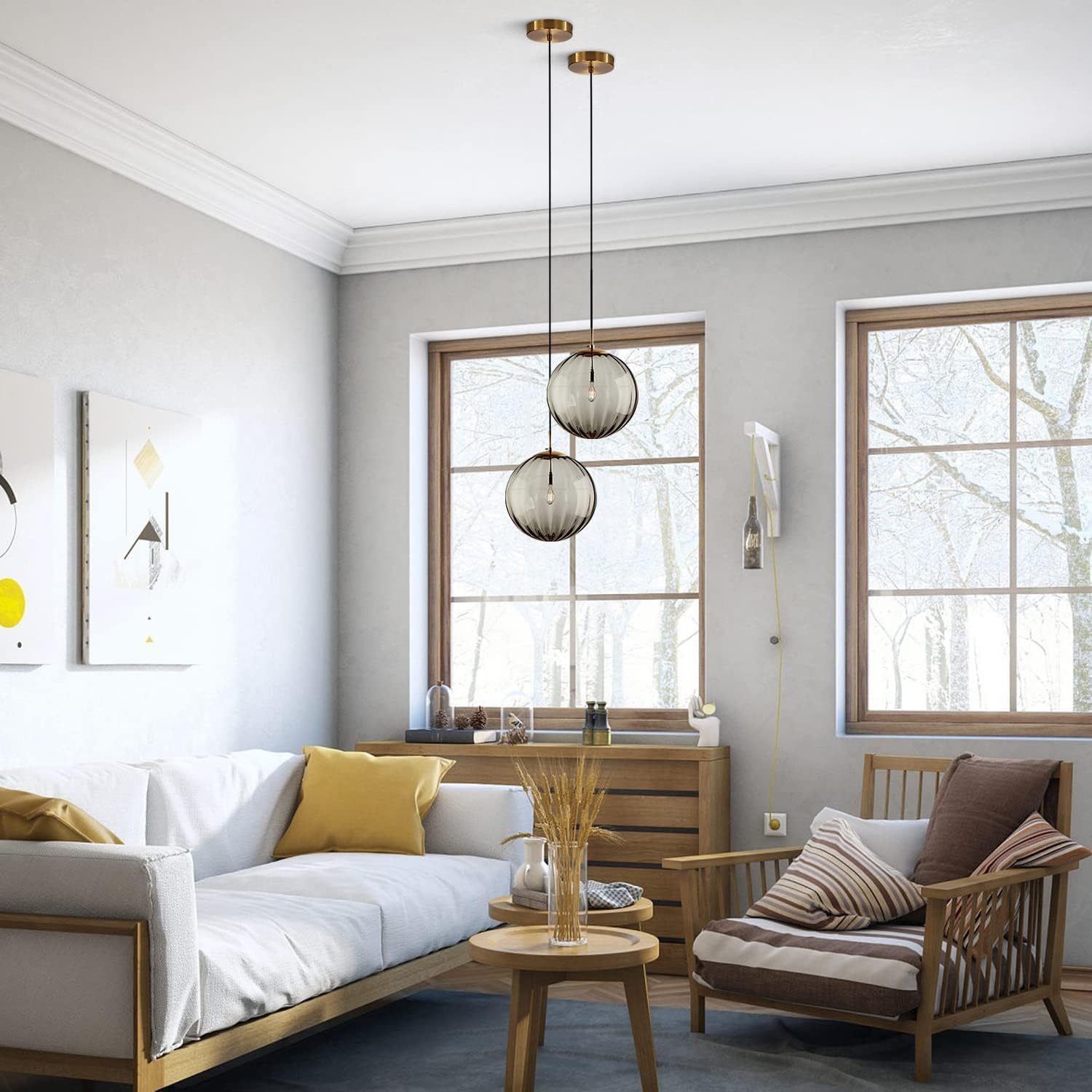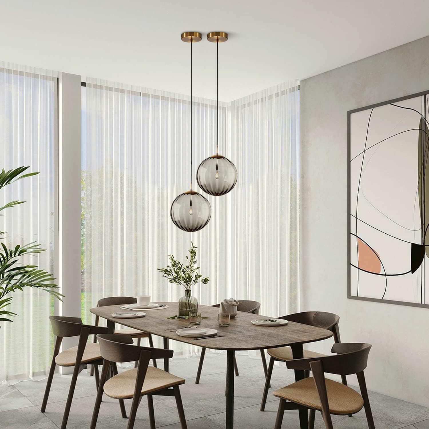 This elegant smoke glass pendant lamp features a hand-blown textured glass shade and a metallic gold fixture. The adjustable 150cm cord and standard E26 bulb base make it versatile for various spaces such as kitchens, dining rooms, and commercial areas. Stylish, minimal, and easy to install.