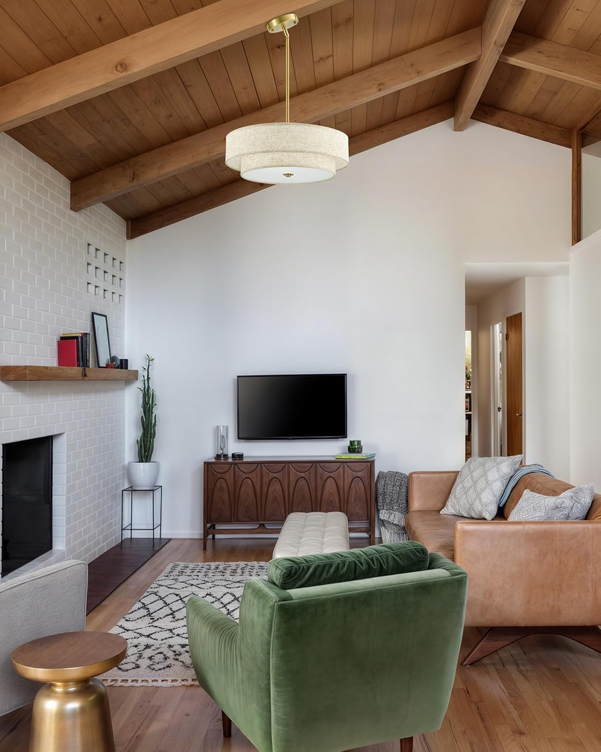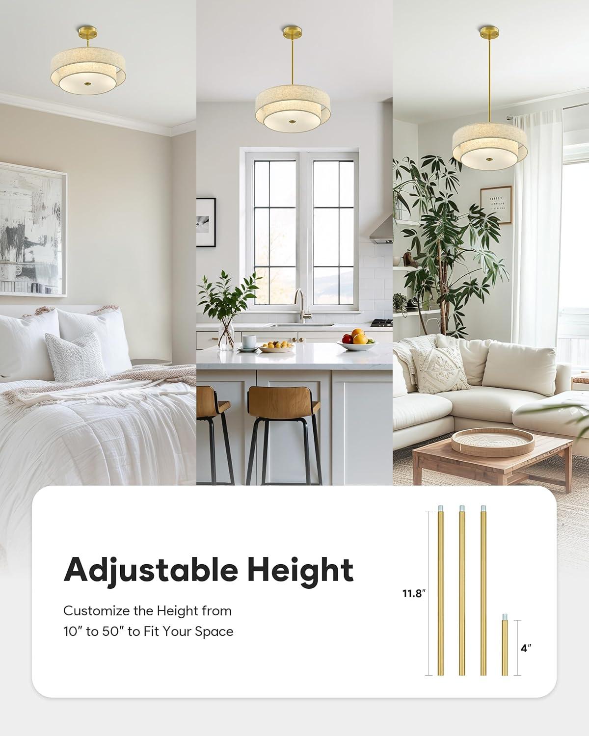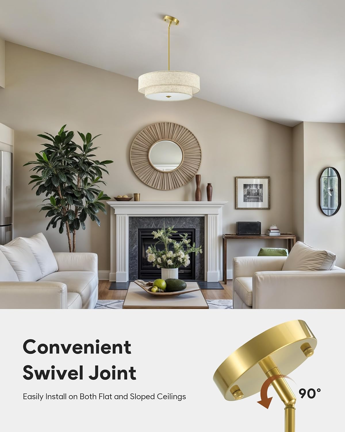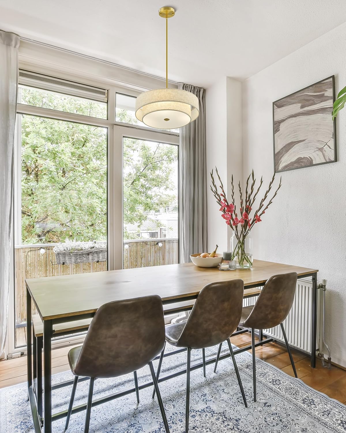This stylish pendant light features a two-layer fabric drum shade and brushed gold finish, offering warm and elegant illumination ideal for modern interiors.